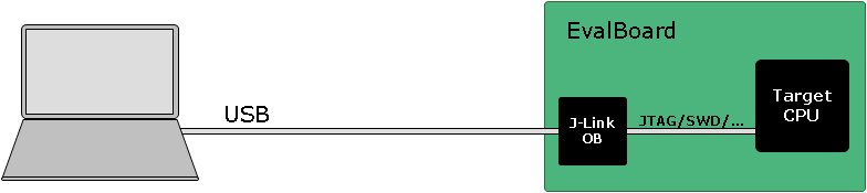 The microcontroller that is used as a J-Link OB (on the left side of the evaluation board in the diagram below) has a USB-interface on its left side (facing the host) and a JTAG/SWD + SWO interface on its right side (facing the target device).