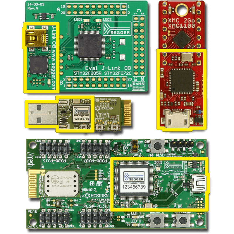 The J-Link OB (for On-Board) is essentially a microcontroller-based, single-chip, J-Link that goes right on the evaluation board. It is compatible with, and has the same features as, J-Link BASE with reduced, but still great, performance.