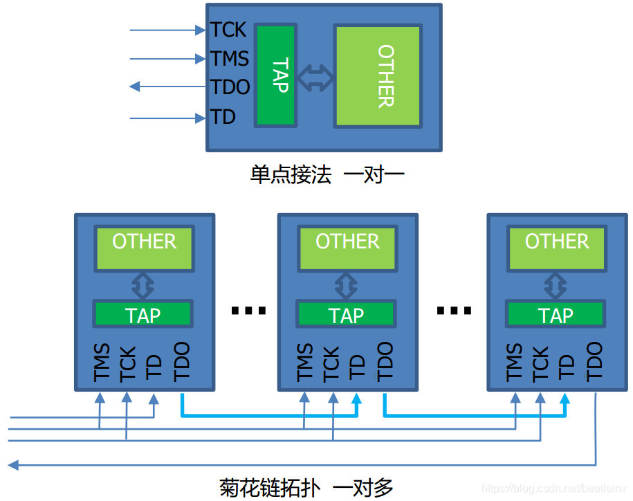 在JTAG接口中,最常用的信号有四个,分别是TCK/TMS/TDO/TDI。JTAG接口可以一对一的使用,也可以组成菊花链的一对多拓扑结构,两种拓扑结构如下图所示。多核的芯片,其芯片内部已经接成了菊花链的形式。