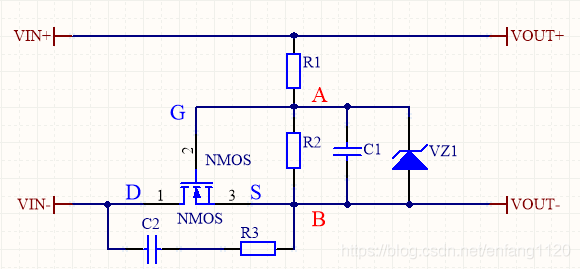 VZ1为稳压管防止栅极电压过高击穿MOS管。NMOS的导通电阻比PMOS的小,最好选择NMOS。