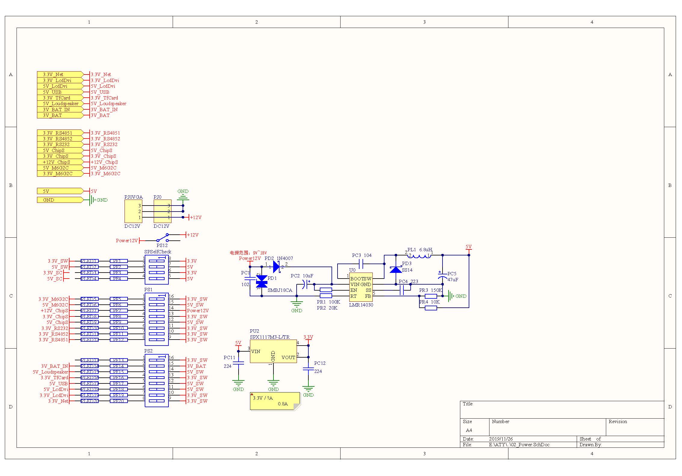 - 这也是第一次接触到这么这么多媒体的一个项目吧,低速部分应该没什么问题,但RGB转VGA的地方还是要优化很多,而且当时没找到RGB转LVDS的方案,所以虽然用了LVDS接口,但本质还是个VGA。电源部分分了各个电源域,当时是想尝试一下做一个自动检修的方式,把拨码开关换成光耦然后对主板进行坏点检测和电源域控制这么一个想法,不过项目需求不大,所以没深入搞,之后可能会在其他项目上体现这么一个完全自动集检测、坏点位置指示、修复或者域屏蔽的想法。电源的话使用了LMR14030的一个DCDC(O_DCDC开关电源LMR14030)。