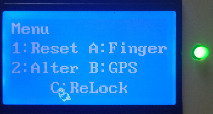 开锁后进入功能菜单,包含复位初始密码、修改密码、显示GPS坐标的功能,按下取消键重新上锁,复位或修改密码后即将密码存入断电可存储的EEPROM,下次开机后即可从EEPROM读取密码进行比对。