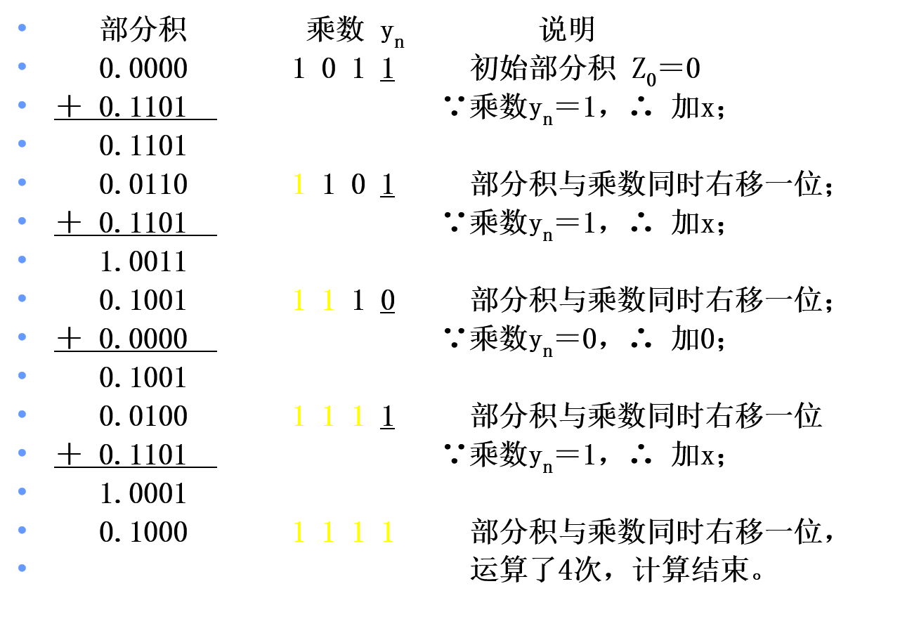 例:设 x=0.1101,y=-0.1011,根据原码一位乘法的算法计算x×y=?