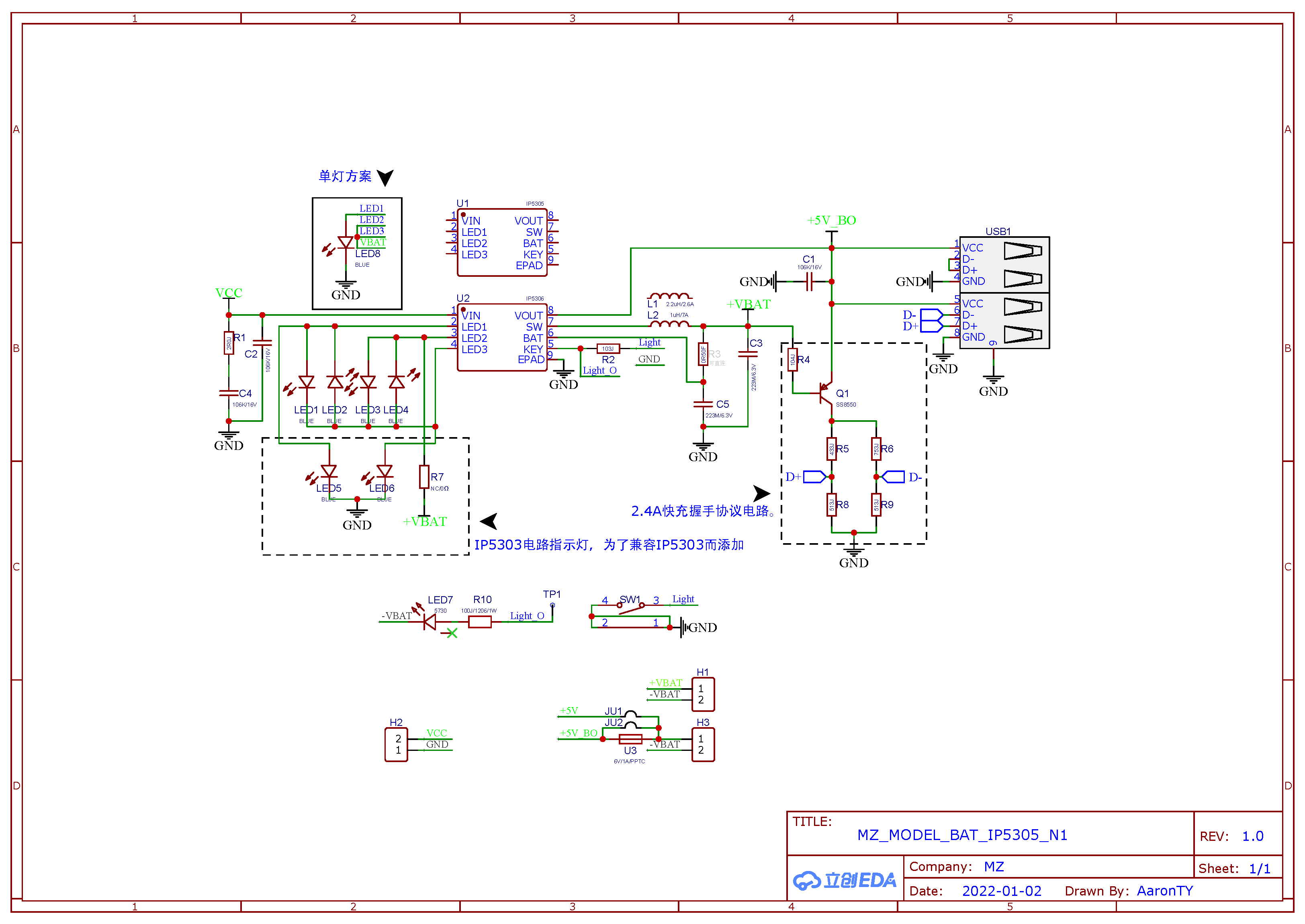 - 已验证,目前IP5305最大充电电流至1A,放电电流700mA,短按1次开启指示及放电,短按2次关闭所有,长按开启手电筒。1灯4灯均可。可以边冲边放边手电筒。